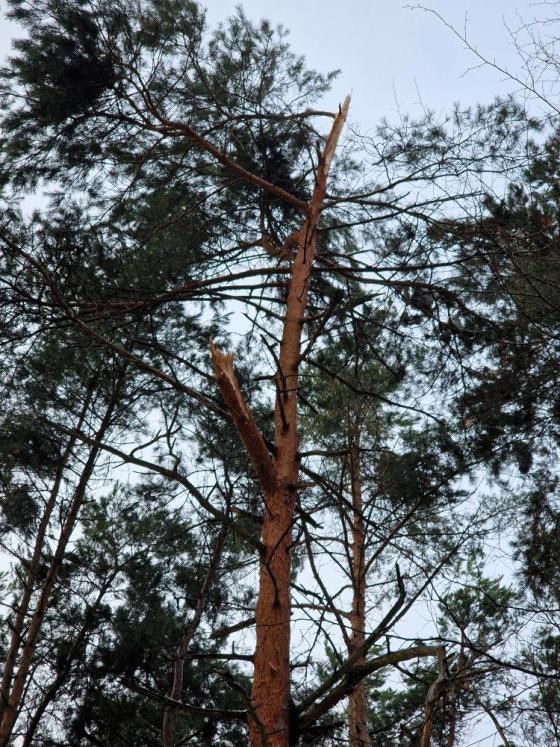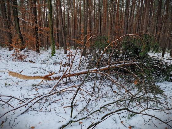 Ostatnie śnieżyce spowodowały wiele uszkodzeń drzew. Pod ciężąrem śniegu łamały się konary, a nawet całe drzewa. Szczególnie widoczne to jest w lasach sosnowych. Część złamanych konarów spadła od razu na ziemię, ale niektóre z nich pozostały w koronach drzew i mogą spaść w każdym momencie.